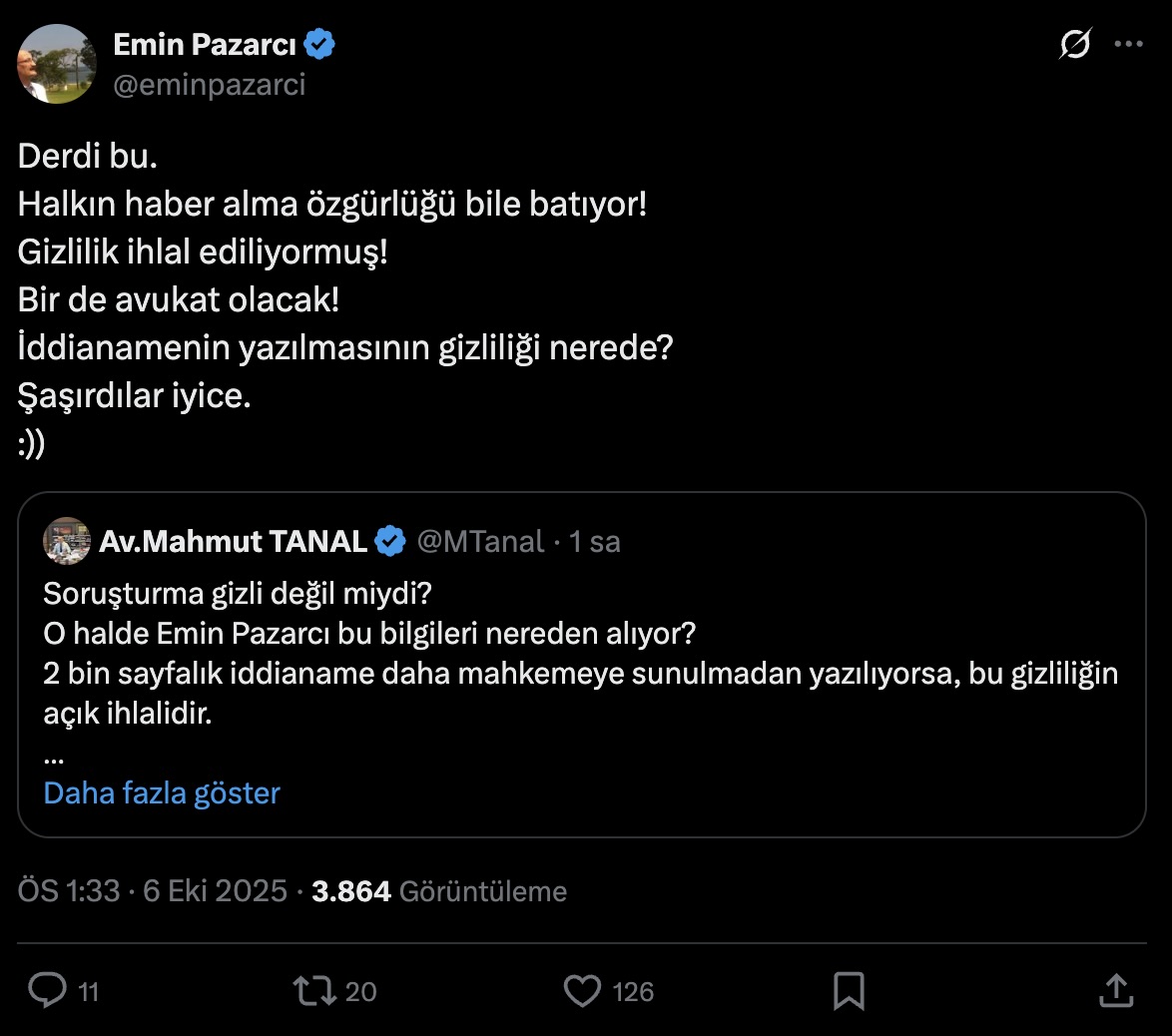 “Soruşturma gizli değil miydi? O halde Emin Pazarcı bu bilgileri nereden alıyor? 2 bin sayfalık iddianame daha mahkemeye sunulmadan yazılıyorsa, bu gizliliğin açık ihlâlidir.