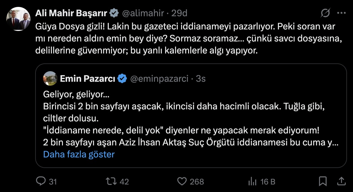 CHP Şanlıurfa Milletvekili Mahmut Tanal, Akşam gazetesi yazarı Emin Pazarcı‘nın, “İBB hakkında iki iddianame geliyor. Biri ‘Aziz İhsan Aktaş suç örgütü’, diğeri Ekrem İmamoğlu hakkında” diyerek iddianamelerin sayfa sayısını ve açıklanacağı tarihleri paylaşmasına tepki gösterdi. “Soruşturma gizli değil miydi?” diye soran Tanal, “Bu, gizliliğin açık ihlâlidir” ifadelerini kullanarak Cumhuriyet Başsavcısı’na “Derhâl soruşturma başlatın” çağrısı yaptı. CHP Grup Başkanvekili Ali Mahir Başarır da “Savcı dosyasına, delillerine güvenmiyor; bu yanlı kalemlerle algı yapıyor” sözleriyle tepkisini dile getirdi.