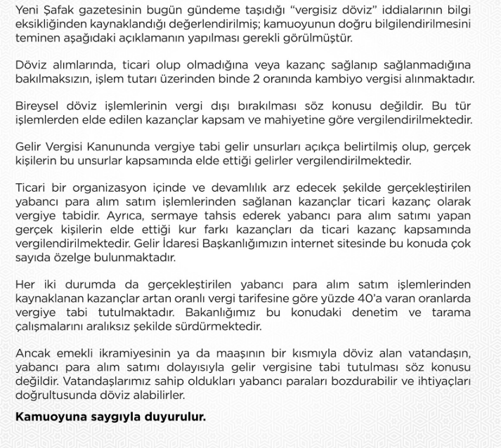Yeni Şafak gazetesinin bugün gündeme taşıdığı “vergisiz döviz” iddialarının bilgi eksikliğinden kaynaklandığı değerlendirilmiş; kamuoyunun doğru bilgilendirilmesini teminen aşağıdaki açıklamanın yapılması gerekli görülmüştür.