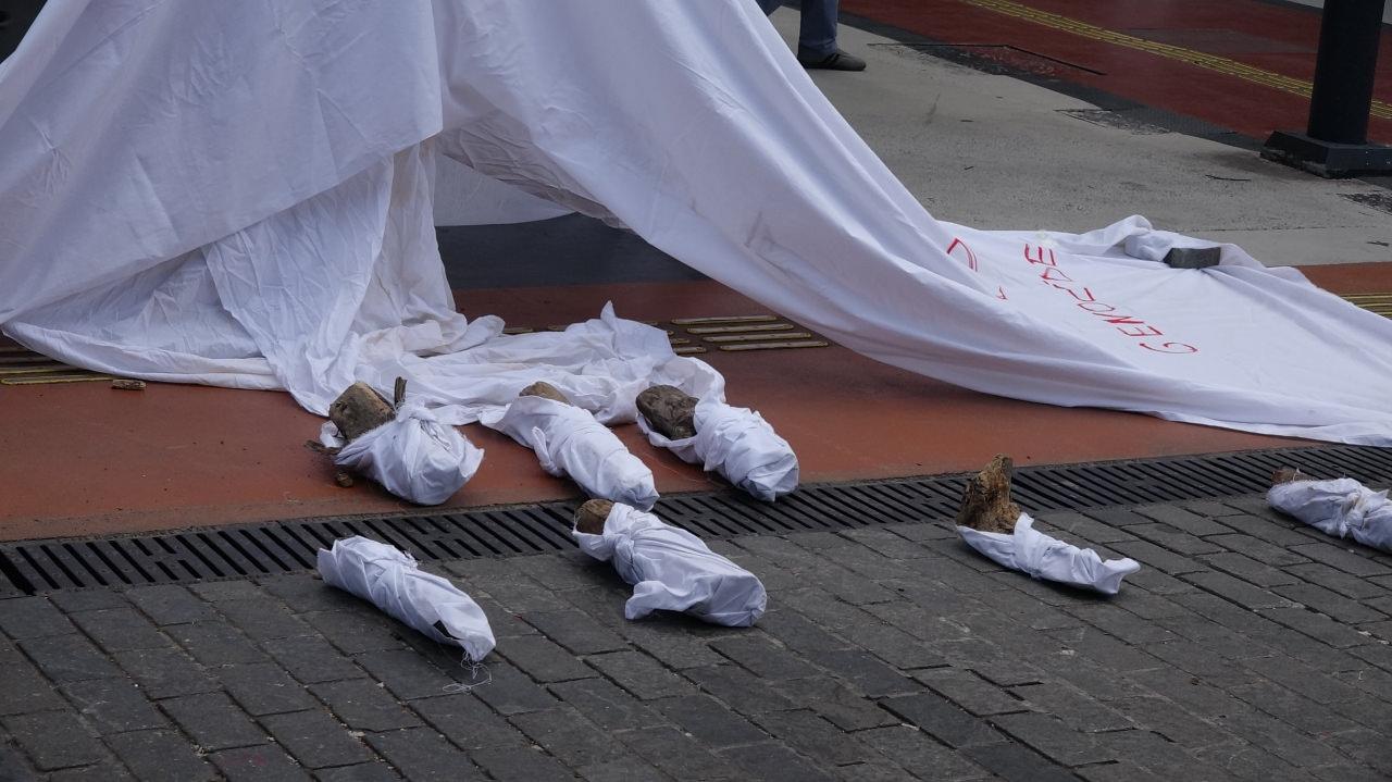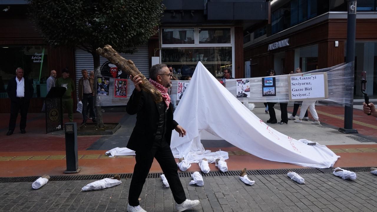 Caddede bulunan ağaç ve aydınlatma direğinin arasına streç film gererek öğrencilerinin Gazze’deki olaylarla ilgili yaptığı görsel çalışmaları sergileyen Sağlam, resimlerinde sivillerin ve çadırların bombalandığı mesajlarını verdi. Temsili bir çadır kurarak kefene sardığı odun parçalarını yerlere dizen Sağlam, “Odunlar uyanın; Gazze’de bebekler ölüyor, insanlık ölüyor” diyerek slogan attı.